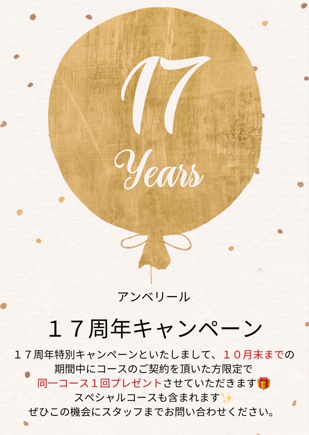 17周年の感謝の気持ちを込めてアンベリールでは10月末までの1ヶ月間限定のキャンペーンをお2つご用意させて頂きました📢✨