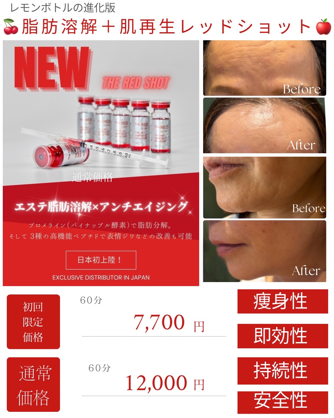 レッドショットとは、韓国で開発された脂肪溶解美容液レモンボトルの進化版で【小顔・たるみ・フェイスライン改善】効果に肌再生美容液がプラスされた最新の美容液です!!また、効果が半永久的なのでリバウンドなし!終わりのあるエステと言われています。