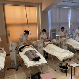 お客様として来校された保護者の方々は、子どもたちから直接フェイシャルエステの施術を受けました。施術を受けながら、3年間で大きく成長した我が子の姿を目にし、喜びを感じていただけたのではないかと思います。