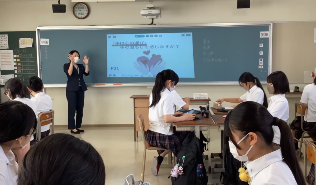 授業の後半では、「手のぬくもり」に焦点を当てたグループワークが行われ、生徒たちは、事前課題として取り組んだ「手を当てる」体験を通して得た気づきや学びを、互いに共有し発表しました。