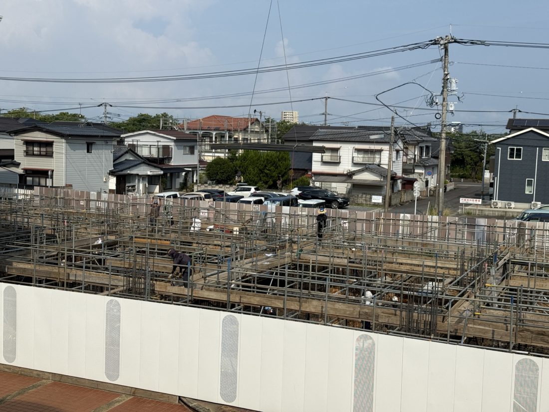 8月29日(金)の朝に撮影した写真をご覧ください。新校舎の基礎部分にコンクリートが敷き詰められ、工事が着々と進んでいる様子がわかります。