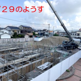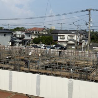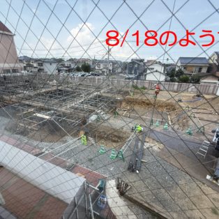 8月29日(金)の朝に撮影した写真をご覧ください。新校舎の基礎部分にコンクリートが敷き詰められ、工事が着々と進んでいる様子がわかります。