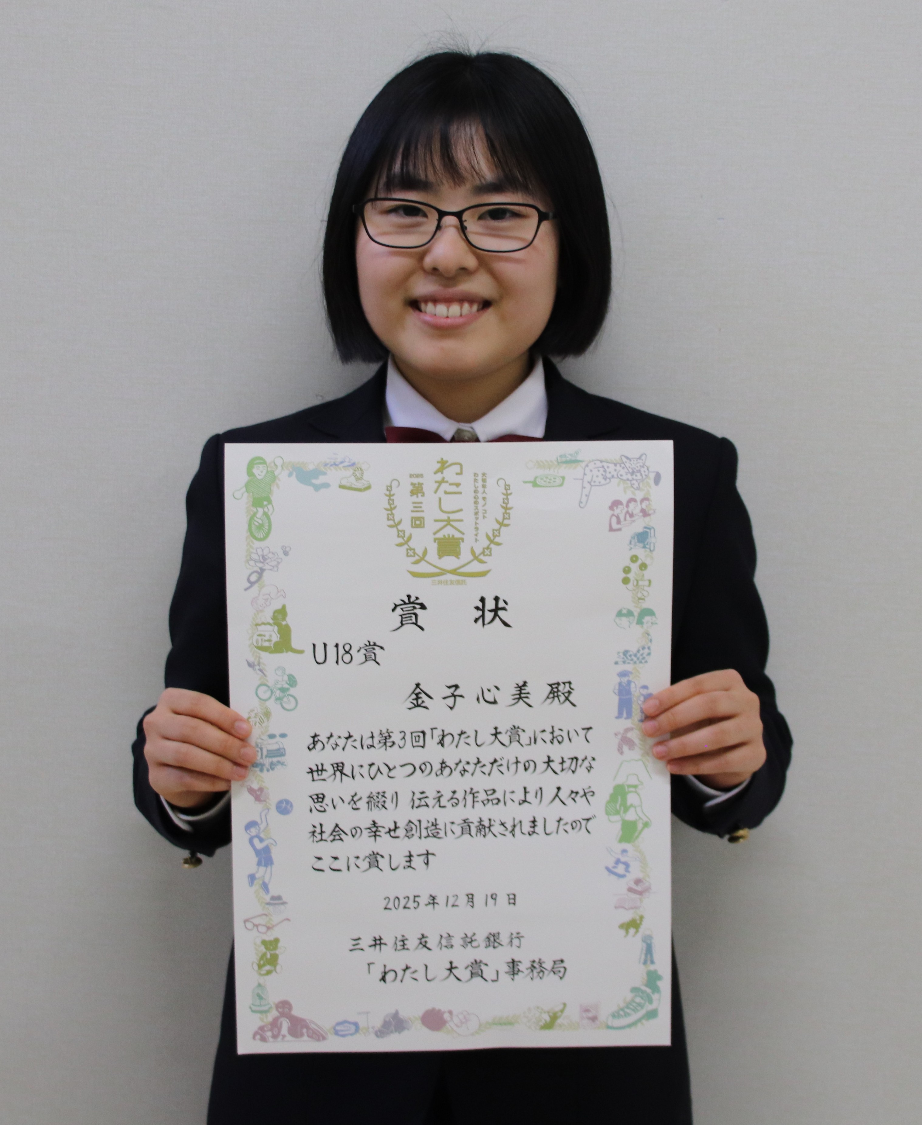 その膨大な作品の中から、本校看護科3年生の金子心美さんの作品「私を守ってくれてありがとう賞」が、わずか3作品のみに贈られる「U18賞」に見事選出されました。この賞は、18歳以下の応募者を対象に、瑞々しい感性と新たな可能性を感じさせる作品を讃える、非常に名誉ある賞です。