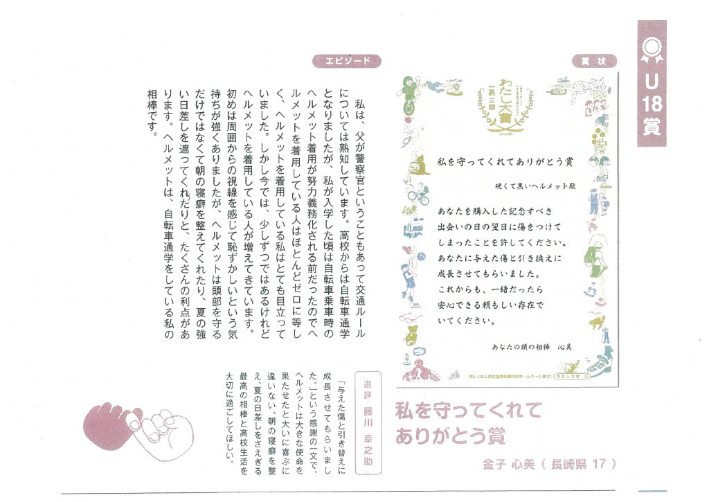 金子さんは、日々の生活の中で、自分を支え、守ってくれている自転車のヘルメットへの深い感謝を、ユニークな言葉選びと実体験に基づくエピソードで見事に表現しました。6,440通りの想いの中から金子さんの言葉が選ばれたことは、本人にとっても大きな自信となったはずです。