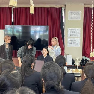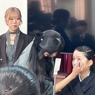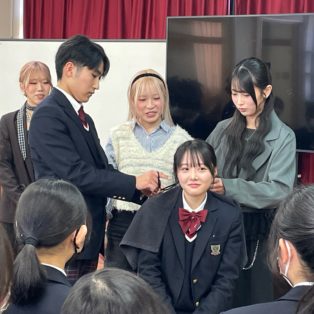 講習会では、モデル役の生徒がプロの技術によって見違えるように変わっていく様子を目の当たりにしました。最初はメイクアップを丁寧に仕上げ、続いてヘアアイロンで華やかなカールを作り、繊細なヘアアレンジへと進む鮮やかな手つきに、生徒たちは目を輝かせながら釘付けになっていました。メイクやヘアアレンジの具体的なポイントを直接教わる表情は真剣そのもので、同じ向陽高校の卒業生という親近感もあり、自分たちの将来像をより具体的にイメージする貴重な機会となったようです。