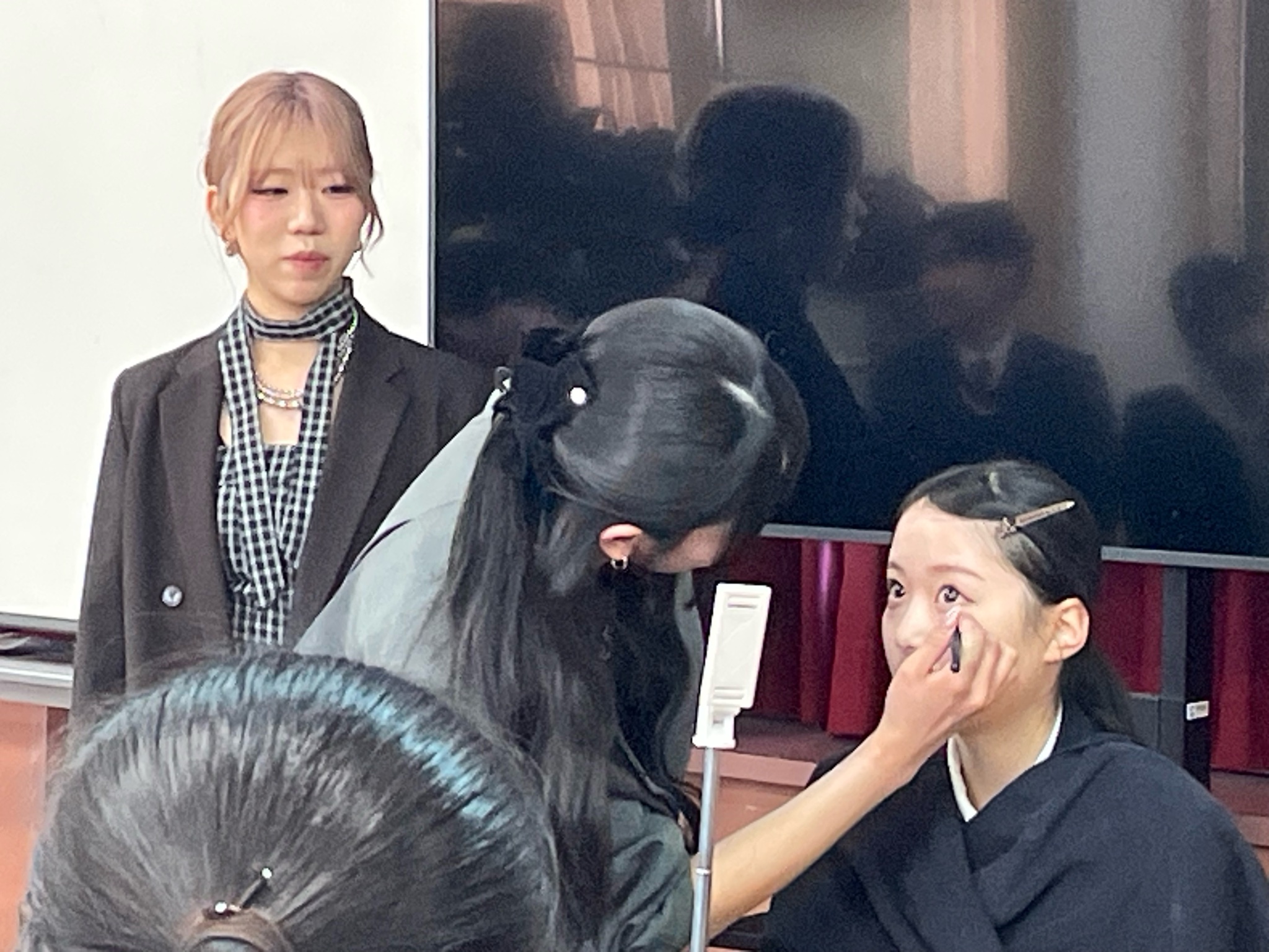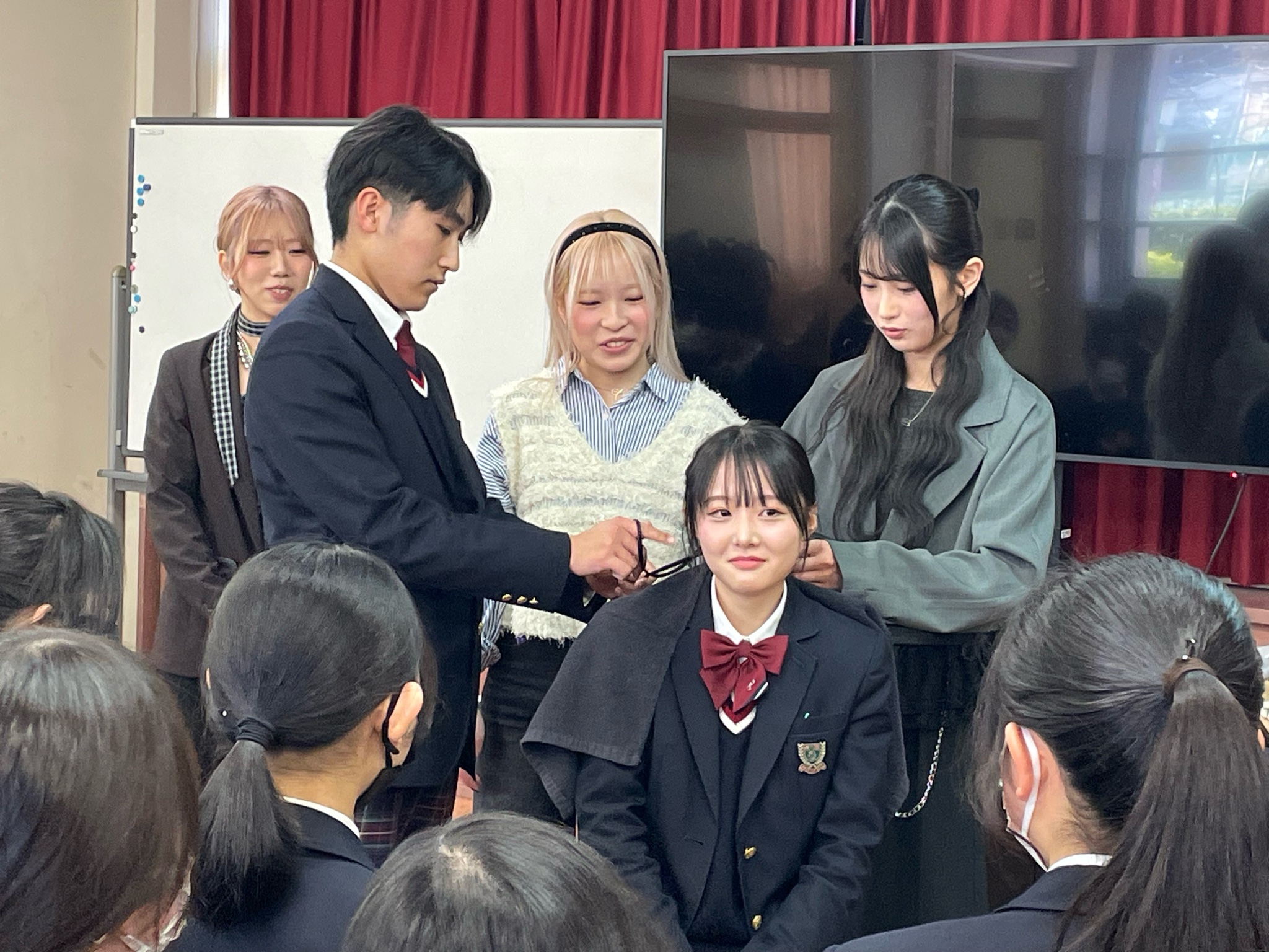 講習会では、モデル役の生徒がプロの技術によって見違えるように変わっていく様子を目の当たりにしました。最初はメイクアップを丁寧に仕上げ、続いてヘアアイロンで華やかなカールを作り、繊細なヘアアレンジへと進む鮮やかな手つきに、生徒たちは目を輝かせながら釘付けになっていました。メイクやヘアアレンジの具体的なポイントを直接教わる表情は真剣そのもので、同じ向陽高校の卒業生という親近感もあり、自分たちの将来像をより具体的にイメージする貴重な機会となったようです。