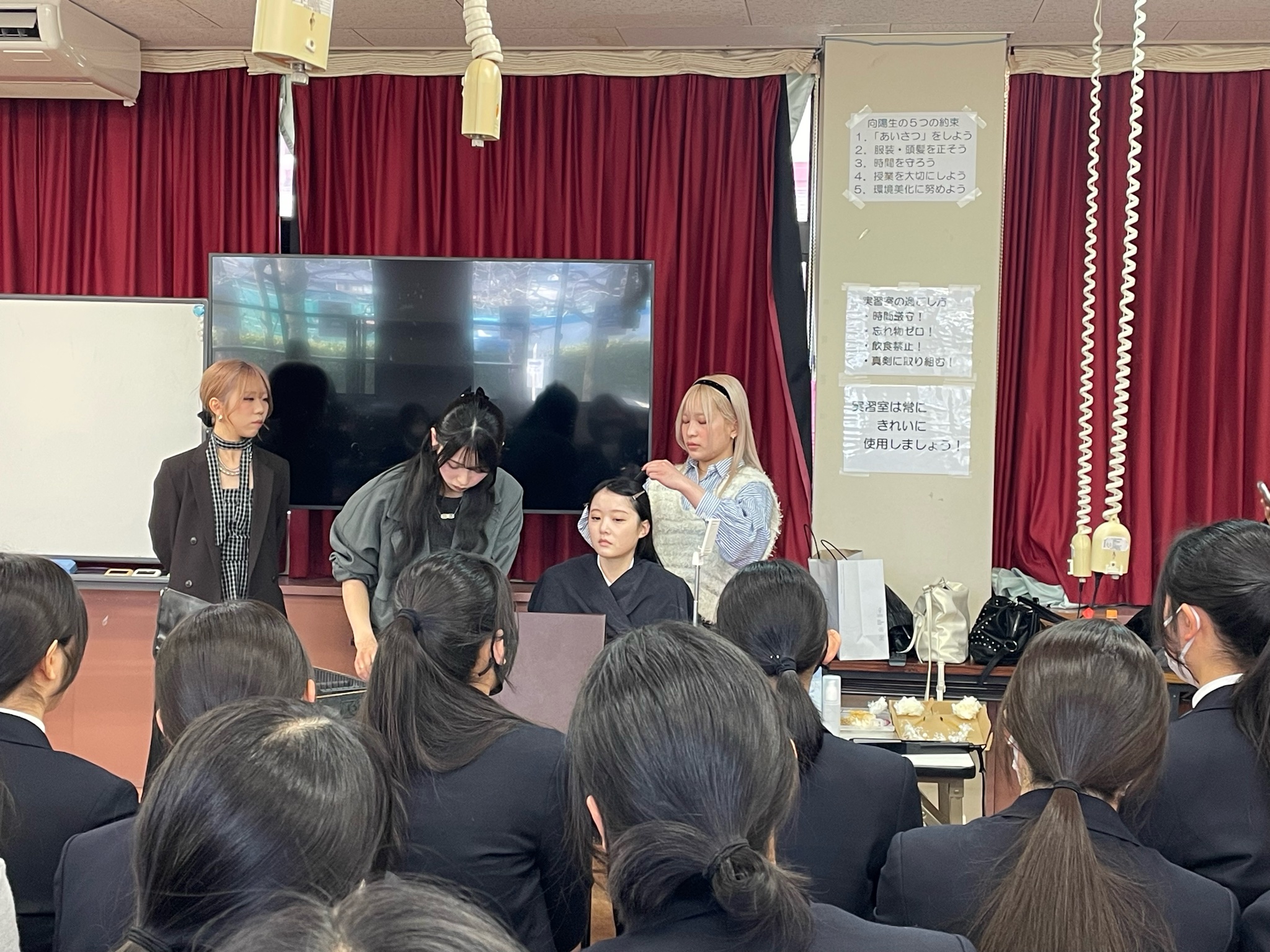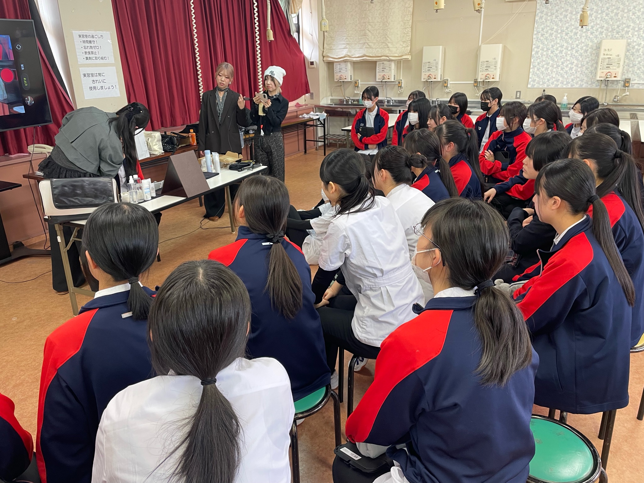 実技の後には、卒業生から職場での日常や、入社1年目で習得した幅広い業務内容についてお話を伺いました。多くの指名を獲得し、やりがいを持って働く先輩方の姿に驚くと同時に、美容という仕事の面白さと奥深さを改めて実感した様子でした。生徒たちのために万全の準備を整え、遠方よりお越しいただいた株式会社サムシングニューコーポレーションの皆様に心より感謝申し上げます。いつか今の生徒たちが、かつての先輩と同じように講師としてこの教室へ戻ってきてくれる日を、教職員一同楽しみにしています。