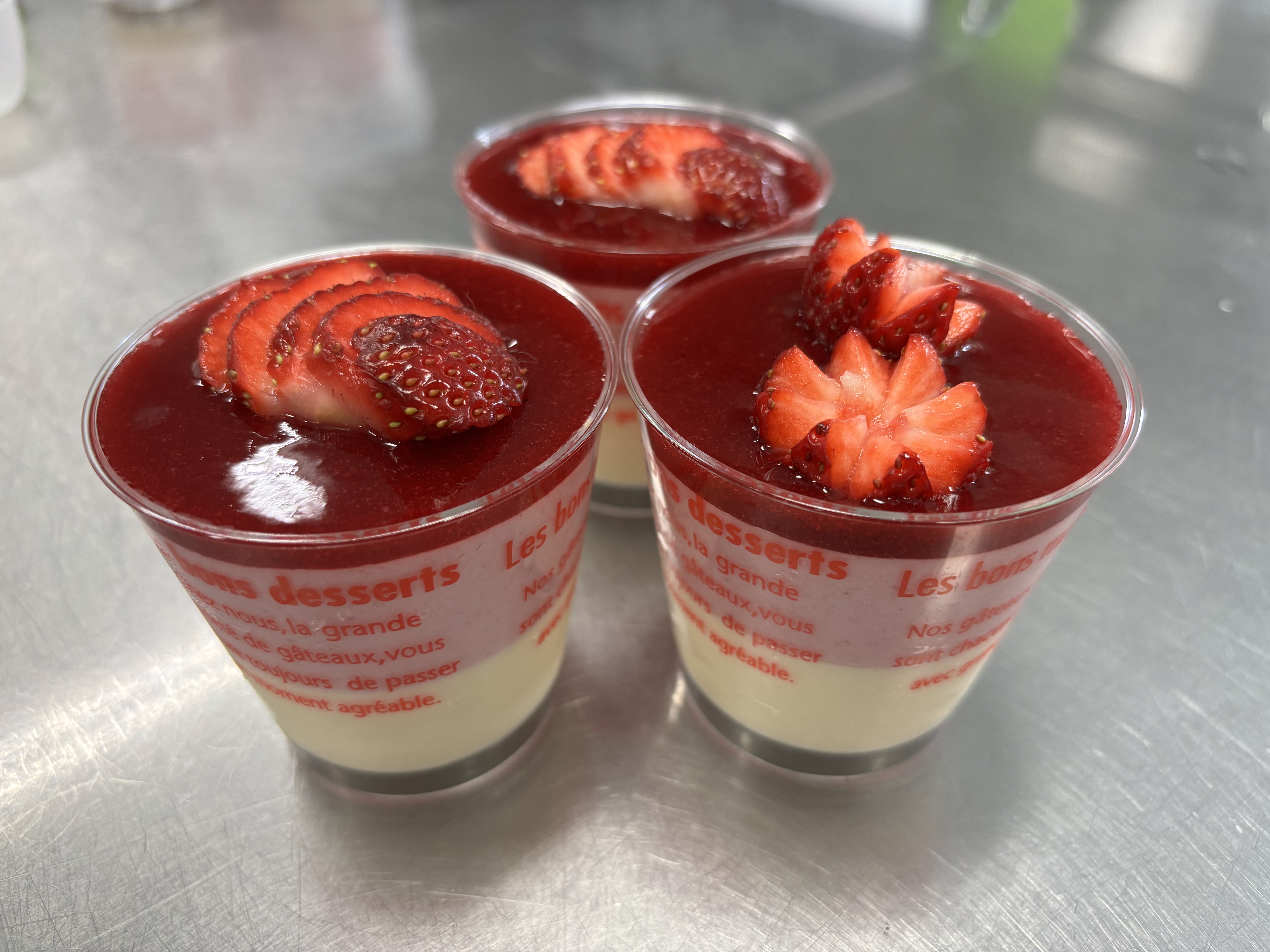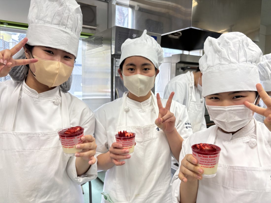 パティシエ科1年生の実習で、「ムース・オ・フレーズ(仏:いちごのムース)」を製作しました。