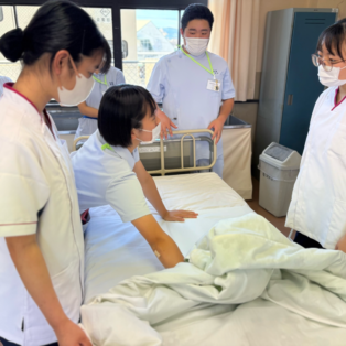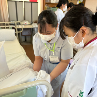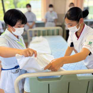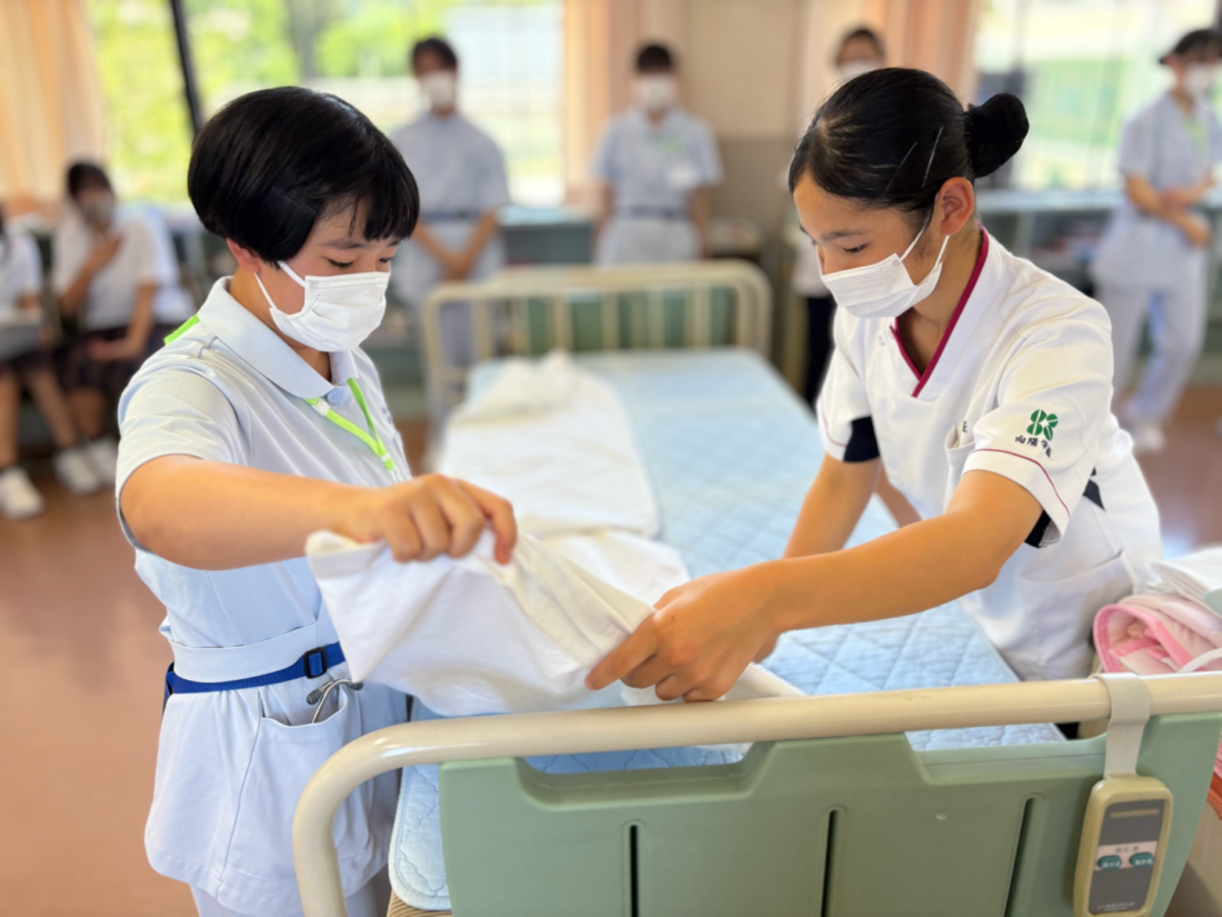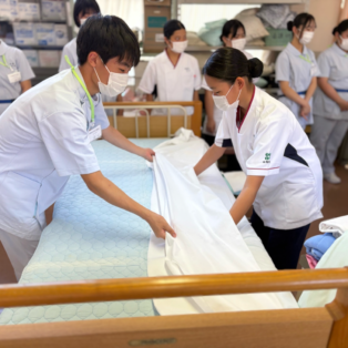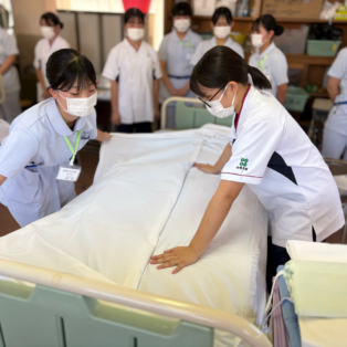 演習の最後には、2年生と1年生が急遽ペアを組み、協力してベッドメイキングを行いました。