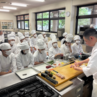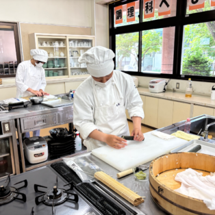 先日、調理科2年生が、すし実習の一環として、「かっぱ巻き」と「鉄火巻き」の実技試験に臨みました。